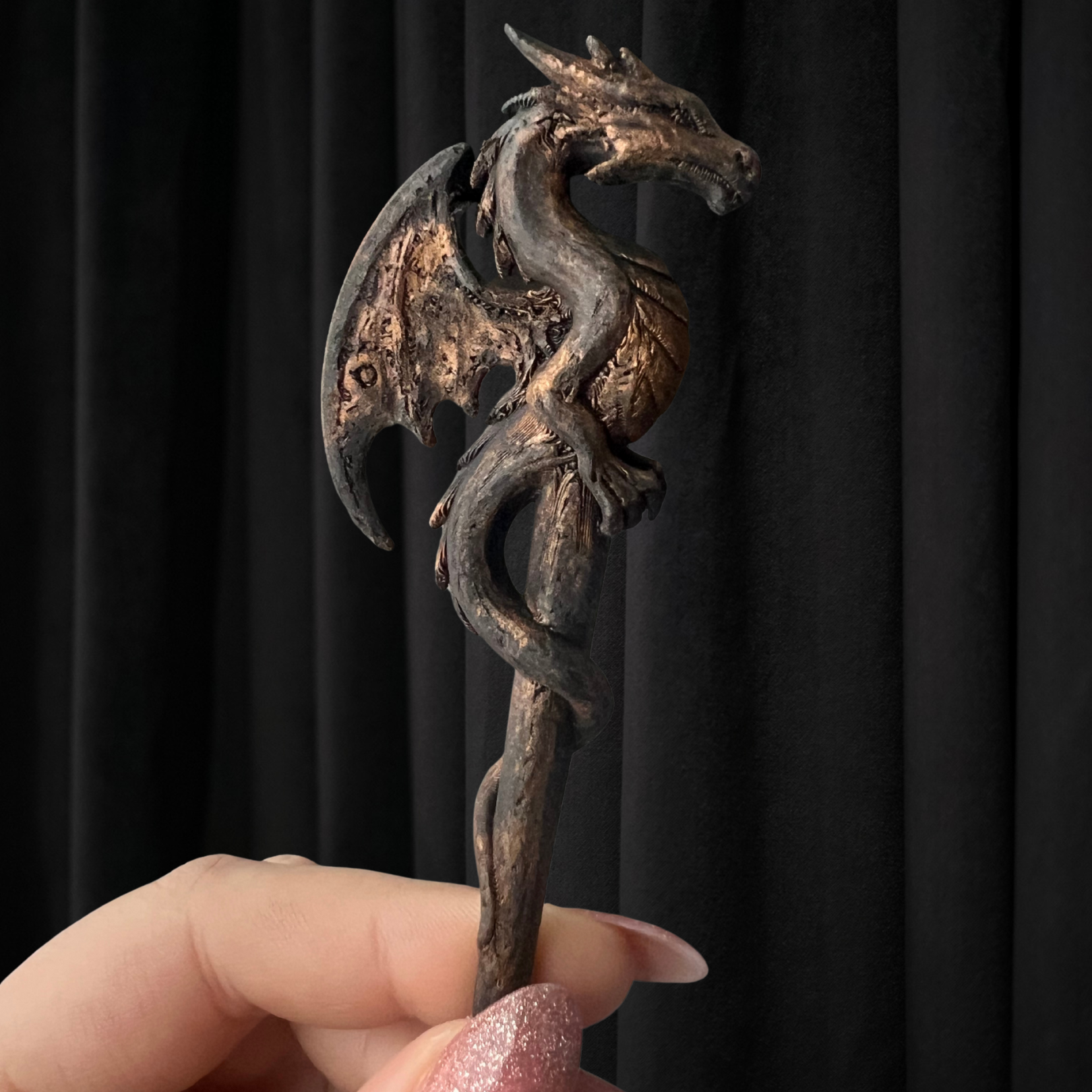 Elegant, unik och full av karaktär – denna hårpinne pryds av ett detaljrikt drakmotiv som gör varje uppsättning extra speciell. Perfekt både till vardags och till fest när du vill addera något riktigt personligt. Draken har två sidor för att passa varje stil, Framsidan är en detaljerad drake och baksidan har en mer rustic kännsla (Se bilderna)