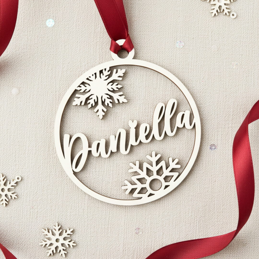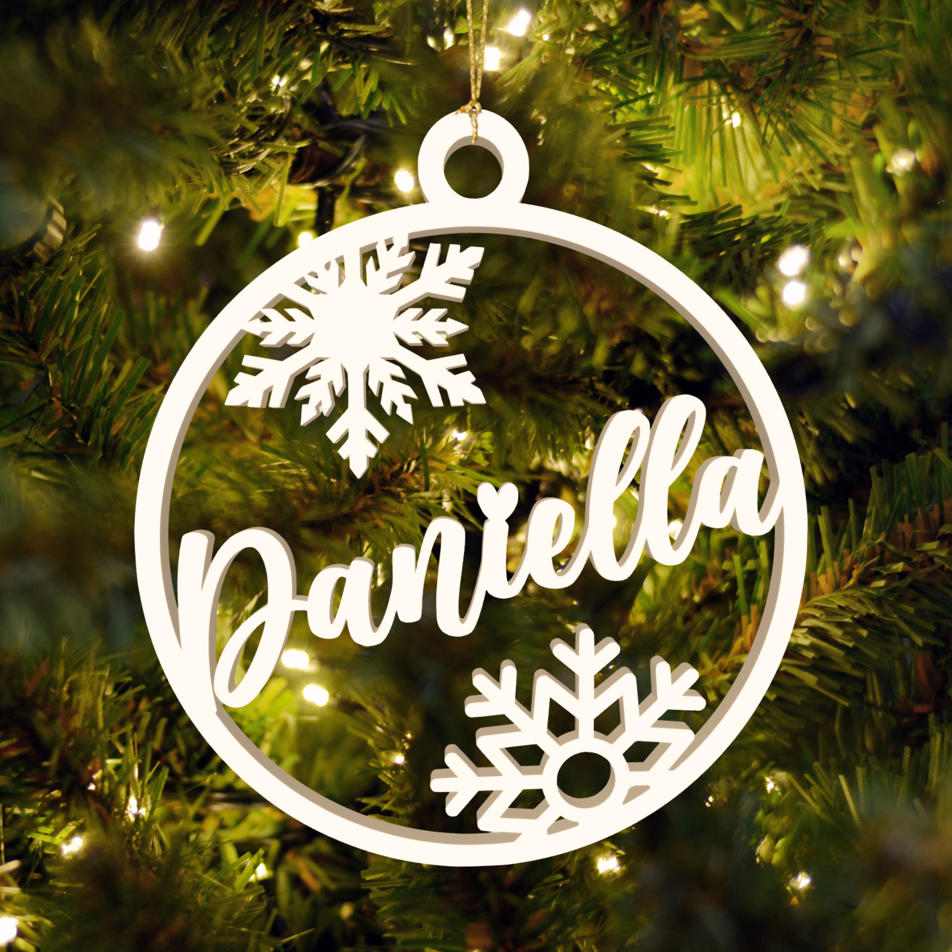 Namnet och de fina snöflingorna ger en varm och personlig touch till julens dekorationer. Julgransdekorationen har en texturerad ytan på framsidan vilket ger den en fin vintrig eftekt och en slät baksida.