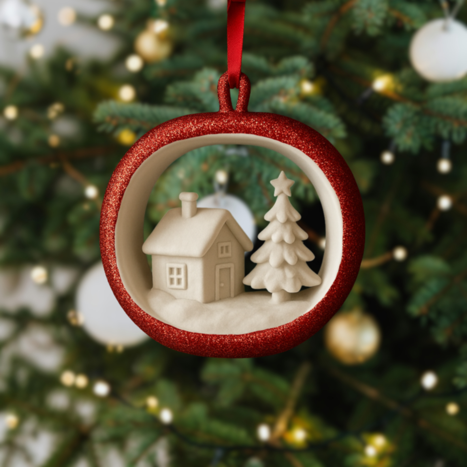 En förtrollande juldekoration formad som ett glittrande vinteräpple, med en liten snötäckt by inuti – komplett med mysiga hus, granar och gnistrande detaljer. Den är ca 10 cm bred och hängs enkelt upp i granen med ett elegant sidenband. Låt ljuset från granen få byn att glimma magiskt och sprid en varm julkänsla i hela hemmet.